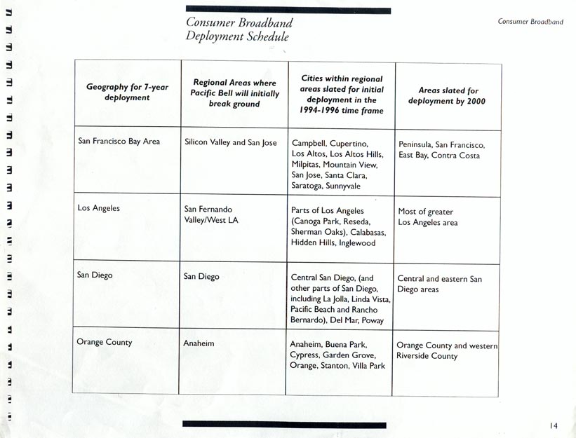 This page outlines the deployment of areas that Pacific Bell had slated for fiber optic upgrades. 5.5 million by 2000, 1.5 million by 1996. Starting with Silicon Valley, San Diego, and Anaheim, and then by 2000, Los Angeles, San Francisco, and Orange County.